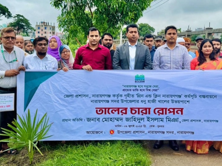 ডেইলি ক্রাইম বার্তা ডেস্ক : তালের চারা রোপণ কর্মসূচির অংশ হিসেবে (গ্রিন এন্ড ক্লিন নারায়ণগঞ্জ) খালের উভয় পাশে ৩ শতাধিক তালের চারা রোপণ করা হয়েছে। বুধবার নারায়ণগঞ্জ জেলা প্রশাসক জনাব, মো. জাহিদুল ইসলাম মিঞা সদর উপজেলার সিদ্ধিরগঞ্জের ধনু হাজী খালের উভয় পাড়ে তালের চারা রোপণ কার্যক্রম উদ্বোধন করেন।