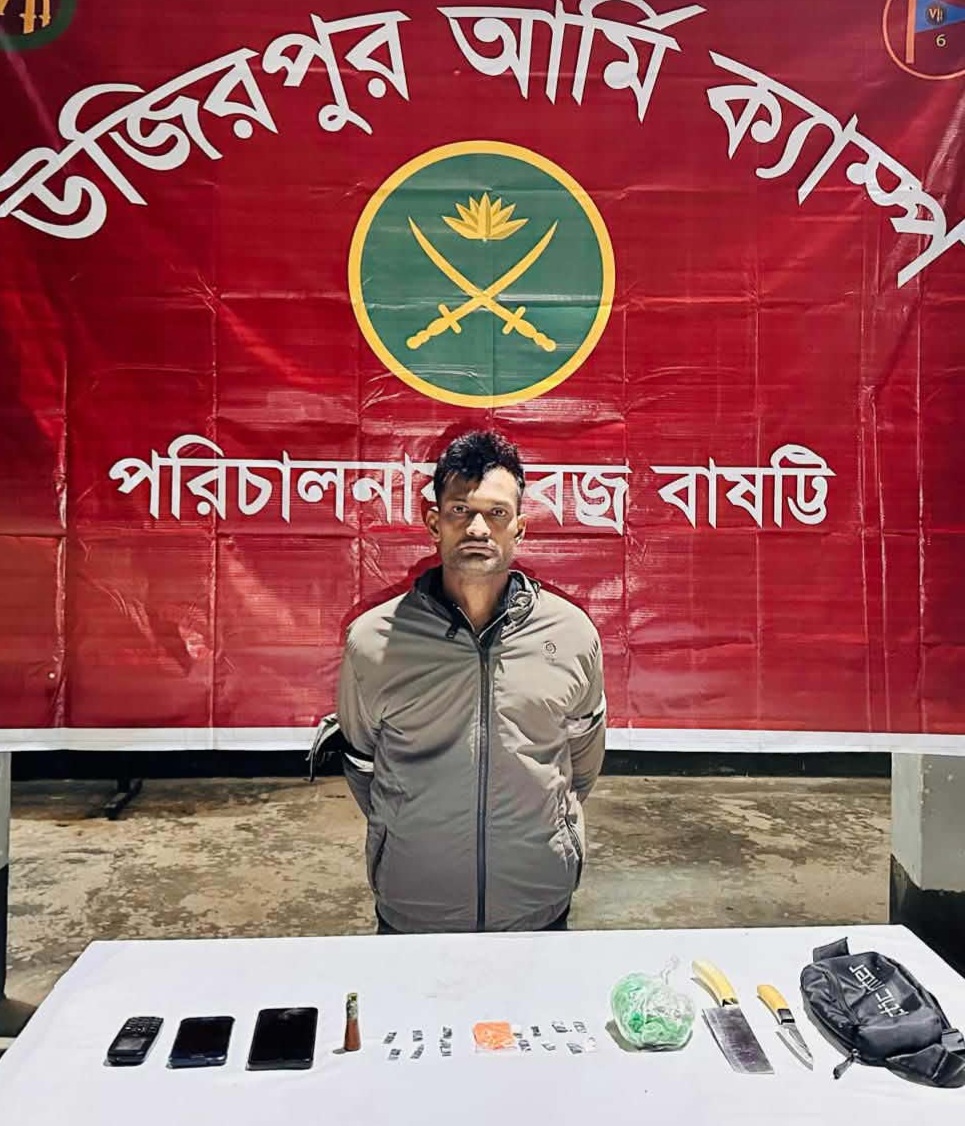 ডেইলি ক্রাইম বার্তা : বাংলাদেশ সেনাবাহিনীর একটি বিশেষ অভিযানে বরিশালের উজিরপুর উপজেলায় এক চিহ্নিত চাঁদাবাজ ও মাদক ব্যবসায়ীকে আটক করা হয়েছে। অভিযানে বিপুল পরিমাণ ইয়াবা ট্যাবলেট, গাঁজা, দেশীয় অস্ত্র ও মাদক সেবনের বিভিন্ন উপকরণ উদ্ধার করা হয়েছে।