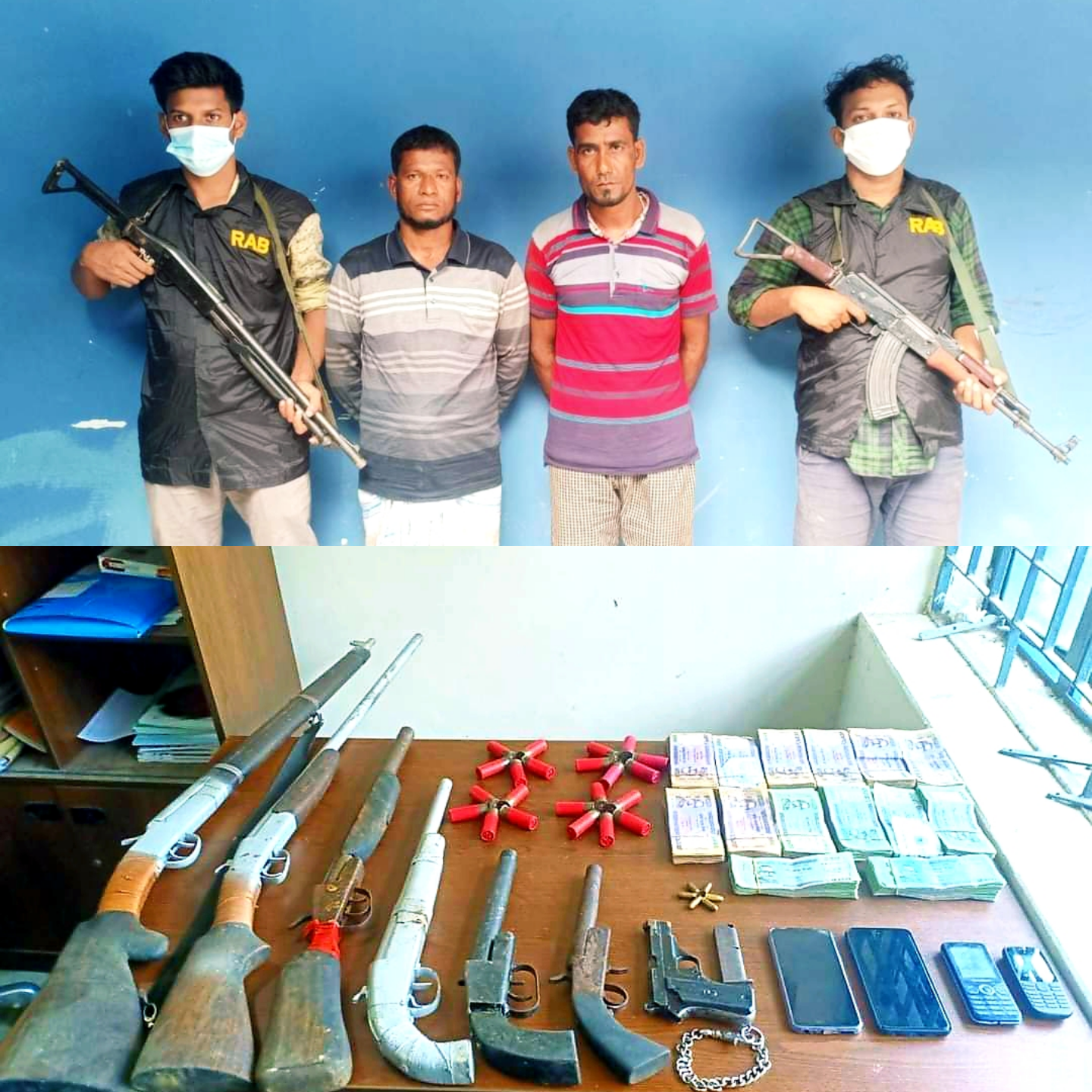 গোপন সংবাদের ভিত্তিতে ১২ মার্চ ২০২১ ইং তারিখ র্যাব-৭, চট্টগ্রাম এর একটি চৌকস আভিযানিক দল নোয়াখালী জেলার হাতিয়া থানাধীন ১নং হরনী ইউপি চরগাছিয়া মৌলভীর চর এলাকায় অভিযান পরিচালনা করে আসামী ১। মোঃ খোকন / খোকন ডাকাত (৪৩), পিতা- ইসমাইল মাঝি সাং- চরগাজিয়া, আব্দুল্যাহ ইউপি, ৫নং ওয়ার্ড এবং ২। মোঃ লিটন (২৮), পিতা- মোজাম্মেল হক, সাং বয়ারচর, চরগাজি ইউপি, ৫নং ওয়ার্ড, উভয় থানা- রামগতি, জেলায়। পরবর্তীতে উপস্থিত সাক্ষীদের সম্মুখে আটককৃত আসামিদের দেহ তল্লাশি করে আসামী মোঃ খোকন / খোকন ডাকাত এর পরিহিত লুঙ্গীর কোচে গুজানো অবস্থায় ০১ টি বিদেশী পিস্তল এবং আসামী মোঃ লিটন এর বামকাধে গামছাদ্বারা সিলিং তৈরী করে ঝুলানো অবস্থায় ০১ টি এলজি উদ্ধারসহ আসামীদের গ্রেফতার করা হয়। আসামীদের ব্যাপক জিজ্ঞাসাবাদে তাদের দেখানো ও শনাক্ত মতে ঘটনাস্থলের বসতঘরের পিছন হতে নিজ হাতে বের করে দেওয়া মতে ০১ টি সাদা প্লাস্টিকের বস্তায় লুকানো অবস্থায় ০১ টি .৩০৩ রাইফেল, ০১ টি এসবিবিএল, ০১ টি থ্রী কোয়ার্টারগান, ০২ টি এলজি, ০১ টি ম্যাগাজিন, ২৮ রাউন্ড গুলি এবং ল্যাপটপের ব্যাগে থাকা নগদ ১১,৩৫,০০০ টাকা উদ্ধার করা হয়। উল্লেখ্য যে, আসামী মোঃ খোকন / খোকন ডাকাতের বিরুদ্ধে নোয়াখালী জেলার হাতিয়া, লক্ষীপুর জেলার রামগতি ও ভোলা জেলার ভোলা থানায় ০৪ টি হত্যা মামলা, ০২ টি অপহরণ ও মুক্তিপন আদায়ের মামলা, ০২ টি অস্ত্র আইনের মামলা, ০২ টি ডাকাতির মামলা , ০১ টি হত্যার চেষ্টাসহ মোট ১৫ টি মামলা রয়েছে। আসামিদের জিজ্ঞাসাবাদে আরো জানা যায় তারা দীর্ঘদিন যাবৎ সুকৌশলে অবৈধ অস্ত্র-গুলি সংগ্রহ করে নিজের হেফাজতে রেখে চরঅঞ্চল এলাকায় বিভিন্ন ধরণের ডাকাতি, অপহরণ ও জিম্মি এবং সন্ত্রাসী কার্যক্রম পরিচালনা করে আসছে।